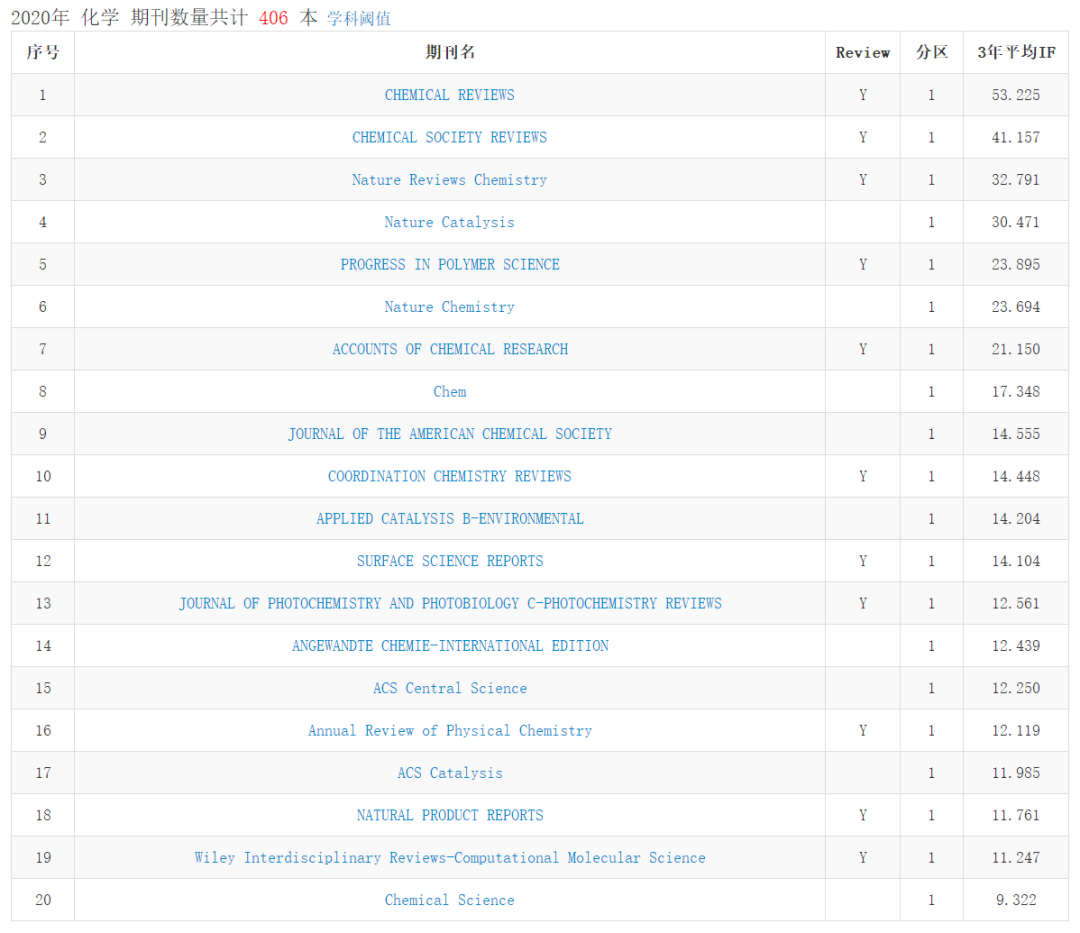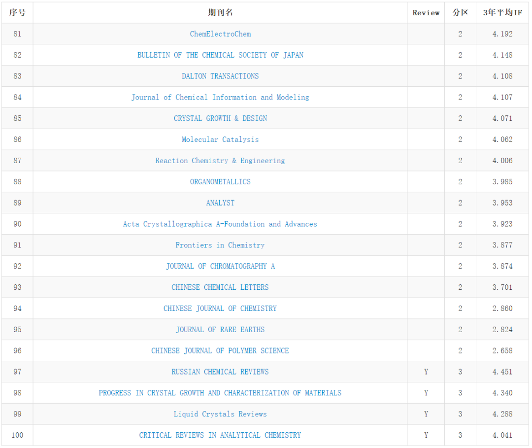 化學類期刊共計406本,這里展示前100名: