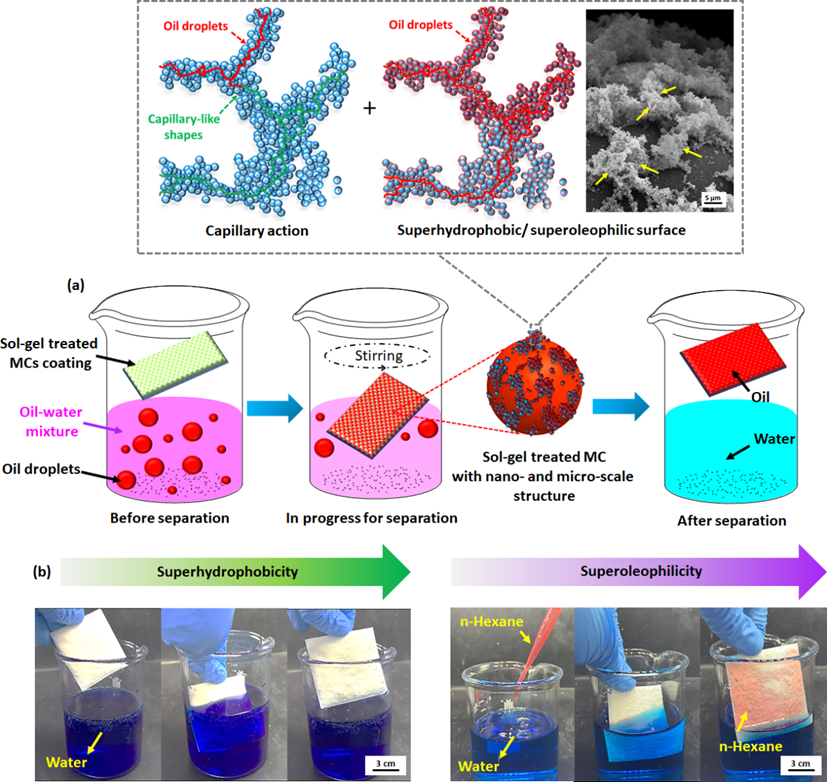 Figure 3. (a) The mechanism of oil-in-water separation performance by sol-gel treated MCs coating; Demonstration of superhydrophobicity and superoleophilicity of sol-gel treated MCs modified coatings: (b) Blue color-dyed water and Red color-dyed hexane in the blue color-dyed water mixture, respectively.