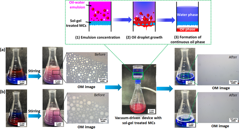 Figure 4. (a) A photograph of surfactant-stabilized oil (n-hexane dyed with Sudan III)/ water (dyed with blue-color) emulsion, water, and oil after separation by sol-gel treated MCs from left to right; (b) A photograph of surfactant-stabilized oil (DCM dyed with Sudan III)/ water (dyed with blue-color) emulsion, water and oil after separation by sol-gel treated MCs from left to right. (OM images showing the size of oil droplets in water). The vacuum-driven device was consist of nylon-(sol-gel treated MCs)-nylon sandwiched construction.