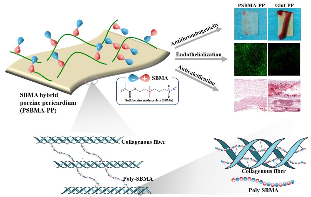 圖1. 兩性離子聚合物雜化的具有抗凝、促內皮、抗鈣化的生物組織示意圖。