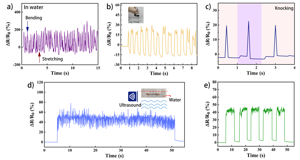 圖1 (a-e)PDA/rGO/Cu/STA織物對各種水下行為的檢測:(b)食指在水中的運動;(c)用鑷子敲擊燒杯邊緣;(d-e)在水下進行連續和間斷的超聲振動