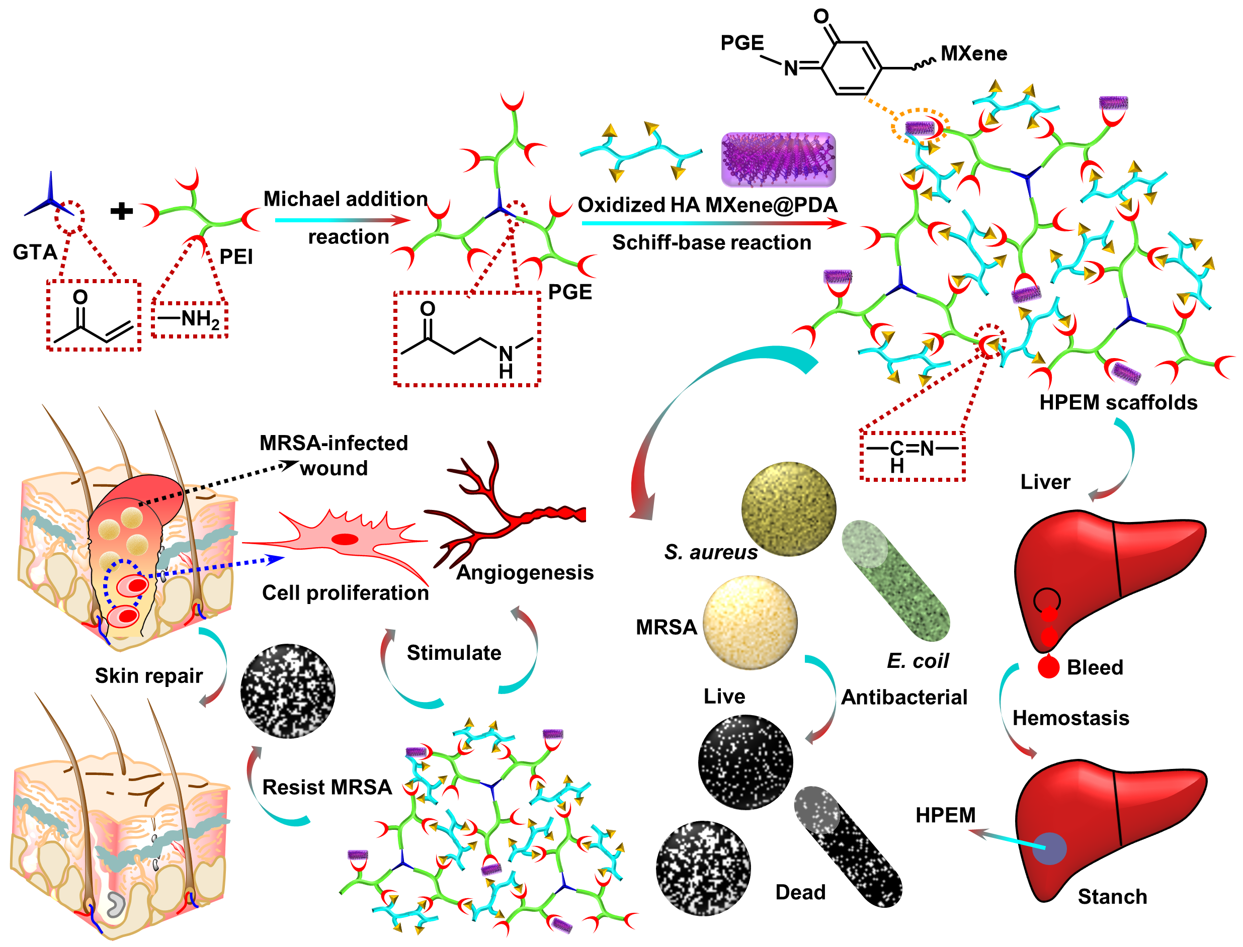 細菌感染是傷口愈合和皮膚再生過程中最常遇到的問題,因感染引起的嚴重炎癥反應不僅顯著增加感染相關的并發癥,而且明顯降低傷口愈合的質量。此外,細菌感染性慢性傷口治療難度大、療程長、費用高,給患者和社會造成巨大的經濟負擔。目前,臨床上主要使用抗生素治療感染性傷口。但是,因耐藥性和缺乏合適的皮膚修復微環境,抗感染和傷口愈合的治療效果并不理想。因此,如何有效抵御多藥耐藥性細菌感染并同時促進感染性傷口愈合和皮膚再生仍是目前亟需解決的一大難題。針對上述問題,西北工業大學張秋禹教授團隊將具有優異電導率、良好生物相容性和較強抗菌能力的二維(2D)Ti3C2Tx MXene引入多功能水凝膠支架(HPEM)用于耐甲氧西林金黃色葡萄球菌(MRSA)感染的傷口愈合研究。