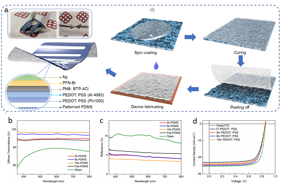 基于這些存在的問題,李剛教授領導的香港理工大學先進材料與電子實驗室(AME Lab)開發了一種全新的基于可拉伸、本征減反襯底的高效柔性有機光伏器件。研究者通過一種簡單有效的減反襯底制備方法,利用聚二甲基硅氧烷(PDMS)復形了商業化3M砂紙的不同表面紋理。相比于剛性玻璃襯底,PDMS襯底在全波段的光透過率更高;紋理化處理(高霧度)不僅進一步降低其反射率,更長的光程也有利于入射光被活性層材料更高效的吸收。通過進一步制備基于PDMS/PEDOT:PSS電極的有機光伏器件后研究者發現,基于6000目砂紙紋理復形PDMS襯底的柔性器件表現出最高的光電轉化效率(15.3%)。另外,頂電極通過密接PDMS封裝處理后形成的三明治結構使得柔性光伏器件在1000次連續彎折(半徑1.5cm) 和200次拉伸(8%-10%)后,仍能保持>83%和>62%的初始PCE值。