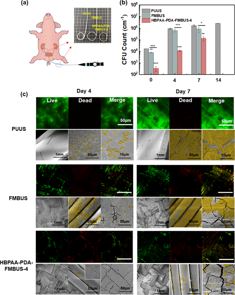 圖3 體內植入后,支架管表面細菌計數、電鏡觀察及活/死細菌染色圖片。