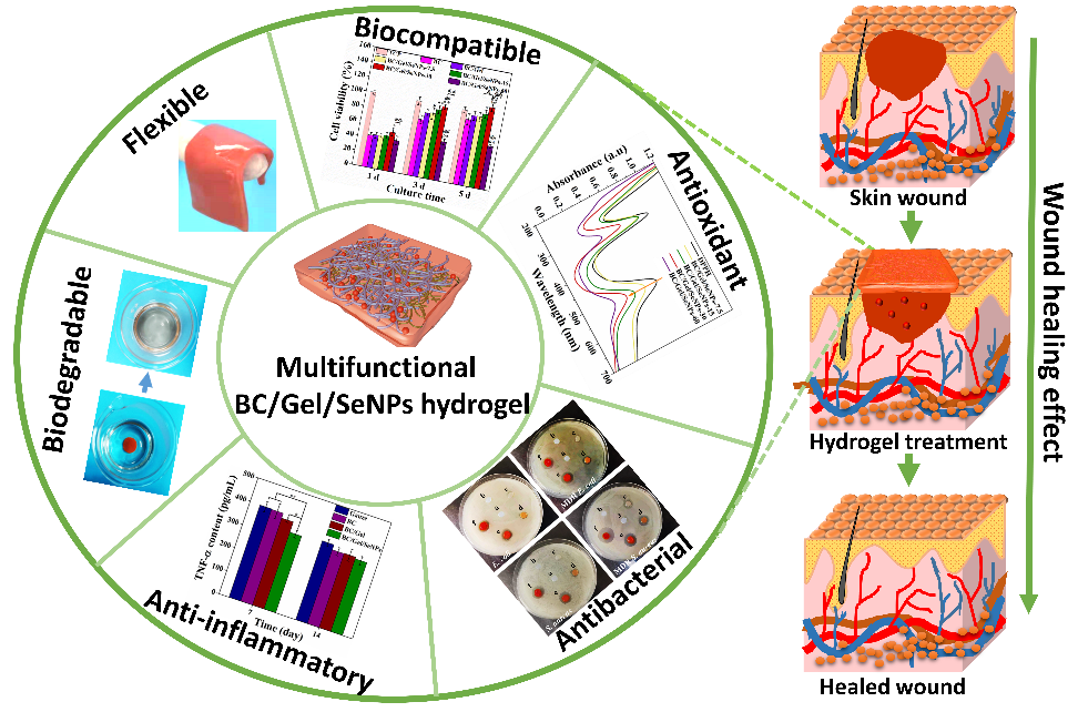 1. 所制備的BC/Gel/SeNPs納米復(fù)合水凝膠表現(xiàn)出優(yōu)異的機(jī)械性能,高溶脹吸水能力,良好的柔韌性和可降解性,以及具有緩慢,持續(xù),穩(wěn)定的SeNPs釋放特性。