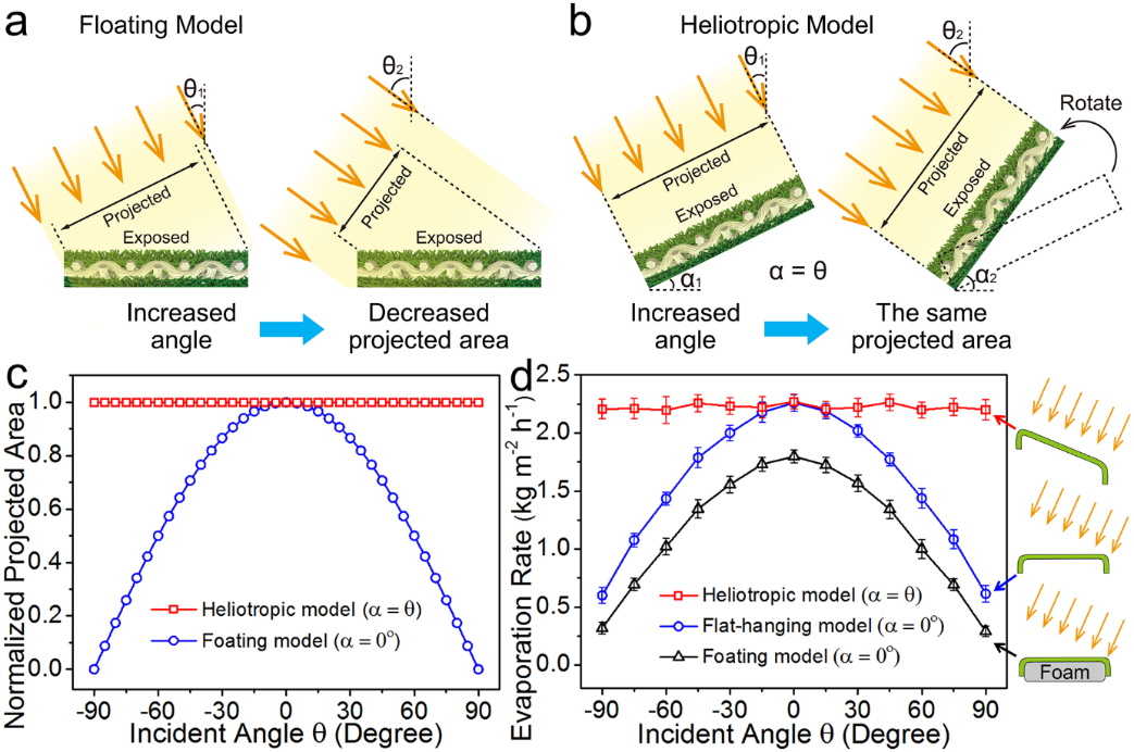 圖3 陽光傾斜入射對不同蒸發模型投影面積的影響。不同入射角照射下漂浮型(a)和向光型(b)裝置示意圖;(c) 兩種模型的歸一化投影面積與入射角度在理論上的對應關系。(c) 漂浮、平掛和向光裝置的蒸發速率與入射角的對應關系