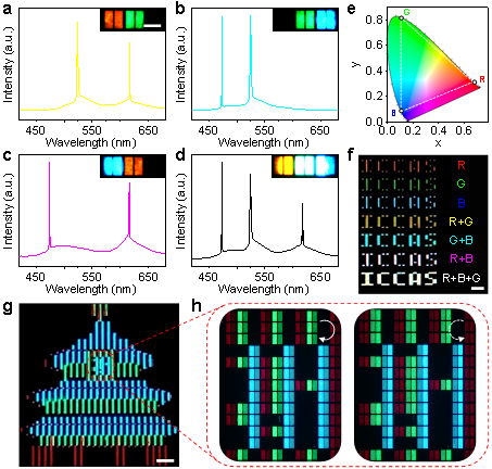 圖2 基于圓偏振激光的全色3D激光顯示。(a-d) 不同子像素組合的激光發射光譜及對應的熒光顯微圖像。標尺為100 微米。(e) 制得的單個像素點的色域覆蓋范圍。(f) 不同子像素組合的“ICCAS”的遠場顯示圖像,表明制備的像素點很好的混色效果。標尺為1毫米。(g) 基于27×27的像素陣列實現的3D激光顯示原型。標尺為1毫米。(h) g圖紅色方框中像素點的熒光圖像。左右兩個圖像分別透過左旋和右旋圓偏振光后獲得。