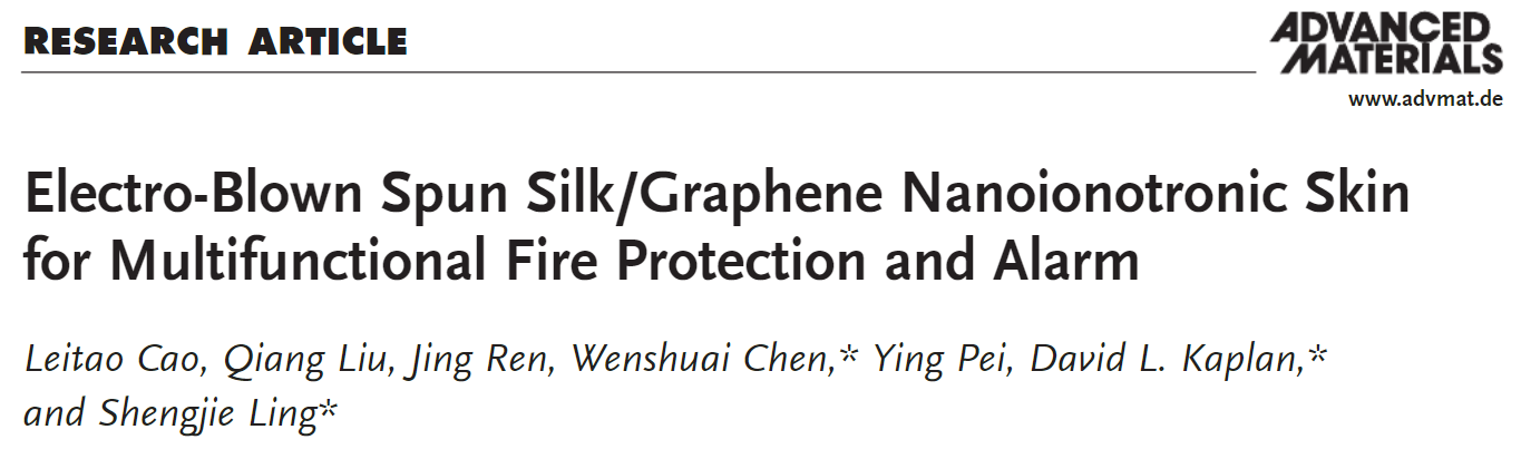 近年來,高仿真機器人技術發(fā)展迅猛,實際應用過程中可能會遇到一些火情的隱患,具有阻燃防護功能的人工皮膚顯示出特定場景下的重要應用潛力。同時,若人工皮膚在對內部器件進行保護的同時,還可對所外界高溫刺激進行響應,實現(xiàn)預警反饋與動作上的有害刺激規(guī)避,則賦予這類人工皮膚更大的應用價值。上?萍即髮W凌盛杰課題組和合作者以蠶絲蛋白的高含鹽溶液及石墨烯為基本原料,采用一種高效的氣流輔助靜電紡絲方法,制備出了具有優(yōu)異阻燃效應和火情預警功能的蠶絲納米纖維/石墨烯多功能電子皮膚。近日,該成果以“Electro-Blown Spun Silk/Graphene Nano-Ionotronic Skin for Multifunctional Fire Protection and Alarm”為題,發(fā)表在Advanced Materials期刊上。