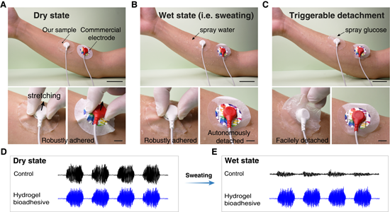 圖2. 刺激響應型水凝膠生物粘合劑用于可穿戴表皮電子產品。