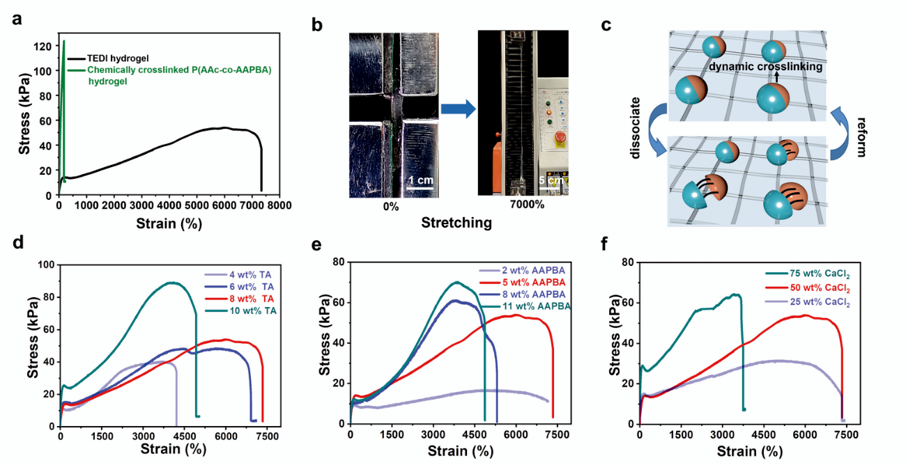 圖2. TEDI水凝膠的機(jī)械性能。(a) TEDI水凝膠和化學(xué)交聯(lián)的P(AAc-co-AAPBA)水凝膠的應(yīng)力-應(yīng)變曲線。(b) TEDI水凝膠被拉伸至7000%應(yīng)變時(shí)的實(shí)物圖。(c) TEDI水凝膠中動(dòng)態(tài)交聯(lián)的可逆解離和重組過程示意圖。(d-f) TA、AAPBA和CaCl2對(duì)TEDI水凝膠機(jī)械性能的影響。