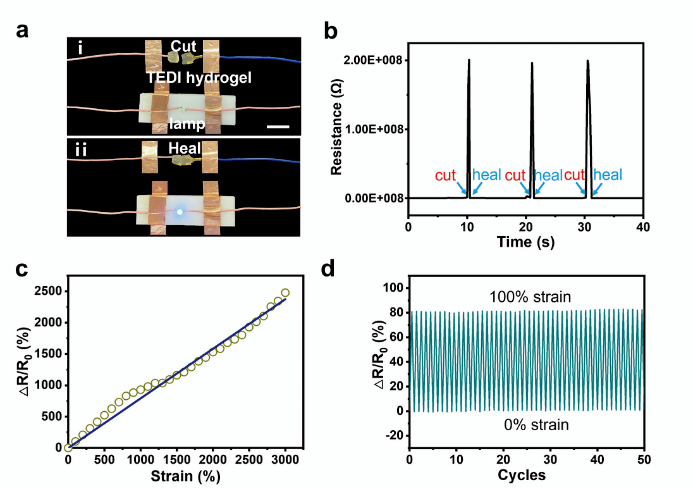 圖5. 超拉伸、自修復(fù)和粘附性TEDI水凝膠作為應(yīng)變傳感器的潛在應(yīng)用。(a) TEDI水凝膠傳感器電導(dǎo)率的恢復(fù)。(輸入電壓 = 4.5 V)。(b) TEDI水凝膠傳感器在三個(gè)連續(xù)切割-愈合過程中的電阻變化。(c) 傳感器在高達(dá)3000%的大應(yīng)變下隨時(shí)間變化的相對(duì)電阻變化。(d) TEDI水凝膠傳感器在100%應(yīng)變下50次循環(huán)的相對(duì)電阻變化的穩(wěn)定性。