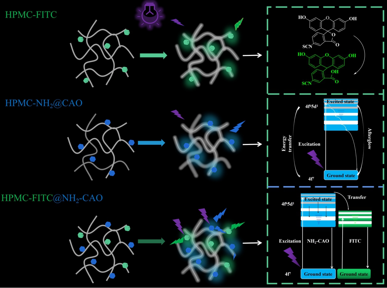基于上述背景,西安工程大學武海良教授團隊在前期高透亮、可折疊、可書寫的長余輝纖維素熒光膜研究基礎上(Carbohydrate Polymers, 2021, 263, 117977),選取具有pH響應性質的有機熒光染料FITC和長余輝特性的無機熒光顏料CaAl2O4:Eu2+, Dy3+作為生色分子,根據它們的激發光譜和發射光譜重疊特性,制備了具有pH響應的雙發射有機-無機雜化長余輝HPMC熒光膜(如圖1和圖2)。得益于HPMC骨架的“錨定”和“稀釋”效應,形成的HPMC-FITC和HPMC@NH2-CAO熒光溶液和固態熒光膜分別在535 nm和480 nm處發出綠色和藍綠色熒光,HPMC-FITC@NH2-CAO雙發射膜可在480和535 nm兩個發射峰長時間持續發出青色光,在極堿條件下顯示更強的熒光強度。與現有纖維素基熒光膜相比,本研究擴大了纖維素基熒光膜的發射波長范圍,延長了環境響應型熒光膜的發光時間,為制備以生物質為基材的智能變色織物涂層材料、防偽材料和靈敏性pH傳感器件提供新途徑。
