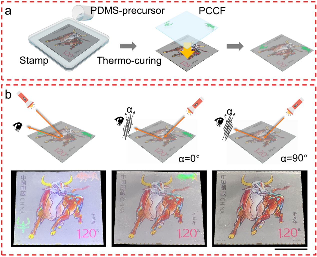 此外,為提高防偽水平,拓展信息安全領(lǐng)域的實(shí)際應(yīng)用,研究團(tuán)隊(duì)將PCCF與2D PC相結(jié)合,進(jìn)一步打造了一種可以承載兩種不同信息的“防偽標(biāo)簽”,利用PC和PCCF的光學(xué)特性明顯不同,實(shí)現(xiàn)了雙參數(shù)控制的可切換圖像,如圖6a所示。這些結(jié)果表明,二維PC層和PCCF層包含獨(dú)立編碼的信息,可以提高信息的保密性,滿足具體情況的需要。