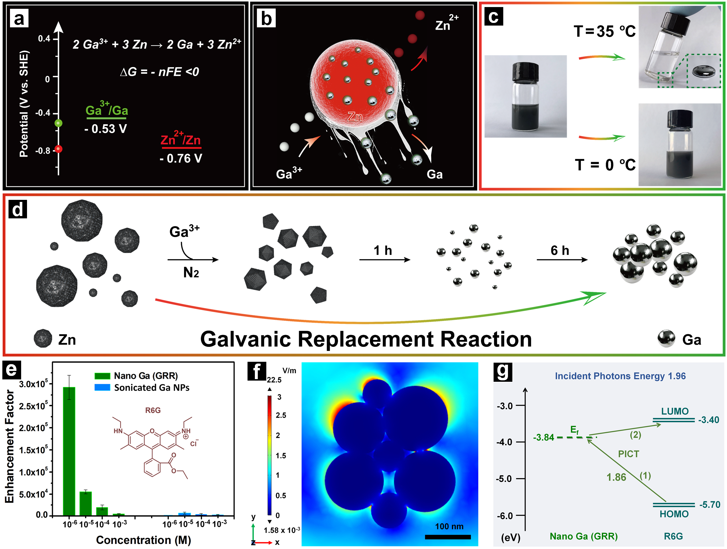 圖2.(a)金屬鋅和鎵的標準電極電位圖。(b) Ga3+和Zn NPs之間反應的示意圖。(c) 在不同溫度下(35 °C and 0 °C)進行GRR之前(左:Zn NPs和GaCl3的渾濁懸浮液)和之后(右)的樣品照片。(d)Zn和Ga3+之間不同反應時間的GRR示意圖。(d)比較R6G在納米Ga(GRR)和超聲處理的Ga NPs上的拉曼增強因子。(e)用FDTD模擬的納米Ga(GRR)的局部電場分布圖。(f)納米Ga的費米能級與R6G分子的HOMO或LUMO能級之間的PICT過程。