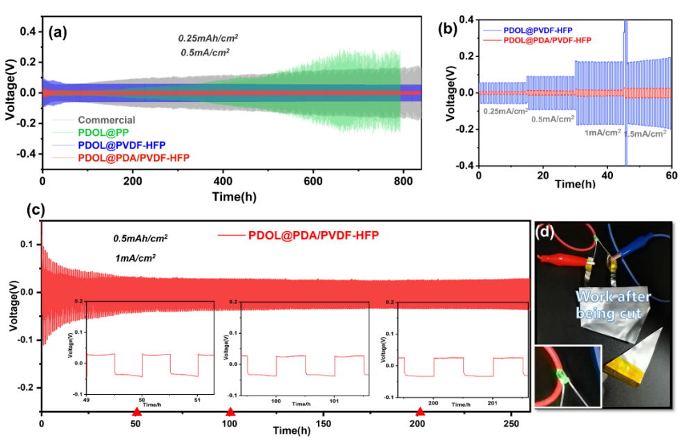 在這項(xiàng)研究中,通過將原位聚合的PDOL與納米纖維膜相結(jié)合,設(shè)計(jì)了一種具有3D結(jié)構(gòu)的新型柔性和安全的聚合物電解質(zhì)。PDA改性的多孔膜不僅為DOL提供了足夠的聚合空間,而且與PP膜相比,對(duì)前驅(qū)體具有更好的親和性和潤濕性,有利于PDOL與納米纖維交織形成均質(zhì)電解質(zhì)。此外,PDA可以增強(qiáng)PVDF-HFP 膜并調(diào)節(jié)Li+離子沉積。PDA上的極性基團(tuán)可以與PDOL上的含氧官能團(tuán)形成氫鍵,有利于提高機(jī)械強(qiáng)度和高離子電導(dǎo)率。同時(shí),它可以防止末端羥基與鋰金屬之間的副反應(yīng),有利于電化學(xué)穩(wěn)定性。這種巧妙的策略有望制造出性能先進(jìn)、安全性高的LMB,與當(dāng)前的電池生產(chǎn)兼容。