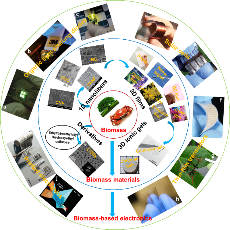 電子行業的快速興起給人類生活帶來了極大便利,但同時也產生了大量電子垃圾,造成了嚴重的環境污染問題。因此,近年來研究和開發可持續和可降解的新型“綠色”電子器件受到了國內外學者的廣泛關注。纖維素和甲殼素是地球上儲量最豐富的生物質資源,具有可再生、可生物降解、耐高溫和易于功能化改性等優點,是制備“綠色”電子產品的理想材料。然而,天然生物質材料具有結構和成分的復雜、親水、功能性差(如:缺乏導電性)等缺點,限制了其在電子產品中的應用。因此,對天然生物質材料進行結構設計、分子改性和功能調控使其滿足電子產品的使用要求至關重要。