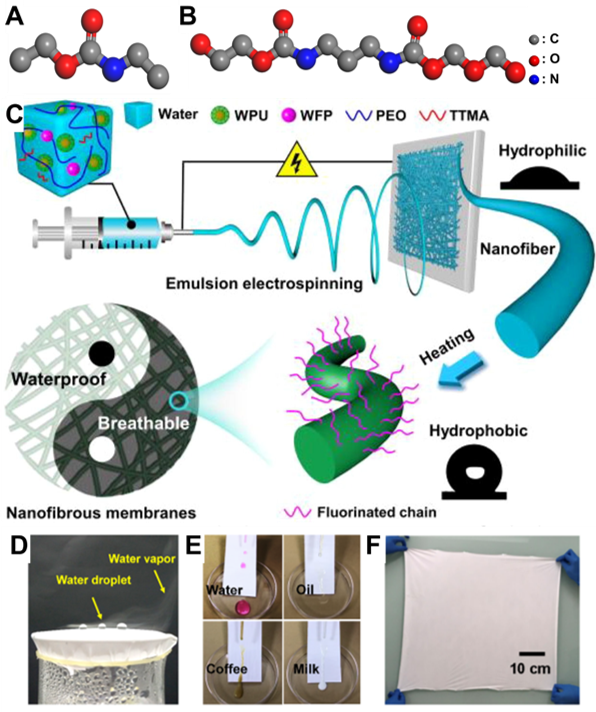 圖3. 基于TPU的防護膜的研究。A) -OCO-NH-基團;B) 典型的PU聚合物分子蓮結構;C)乳液靜電紡絲制備防水透濕紡織品意圖;D) 防水透濕性能演示圖;E) 疏液性演示;F) PU/C6FPU-2/MgCl2-3纖維膜的大尺寸樣品圖片。