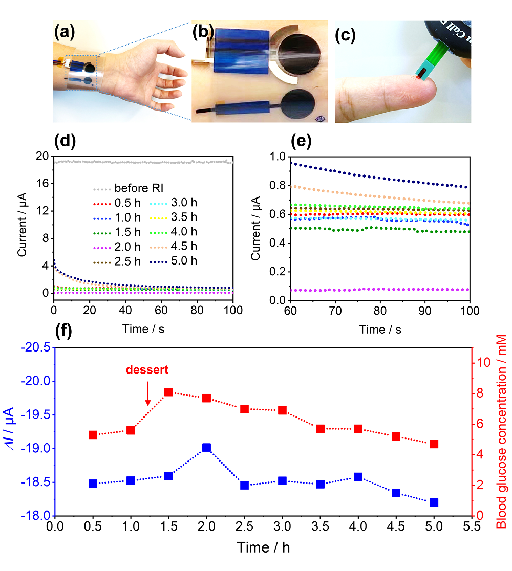 圖 3. 皮表測試。(a)貼在志愿者手腕上的傳感貼片。(b)a中傳感器和電滲輔助電極的放大視圖。(c)使用指尖血糖儀進行體內侵入性血糖測量。(d)在0-5 h內由緊貼皮表的傳感貼片記錄的I-t 曲線(RI之前和之后)。(e)不同時間點RI后d中響應電流的放大視圖。(f)指尖血糖儀(紅色)和無創傳感貼片(藍色)的血糖測試結果。