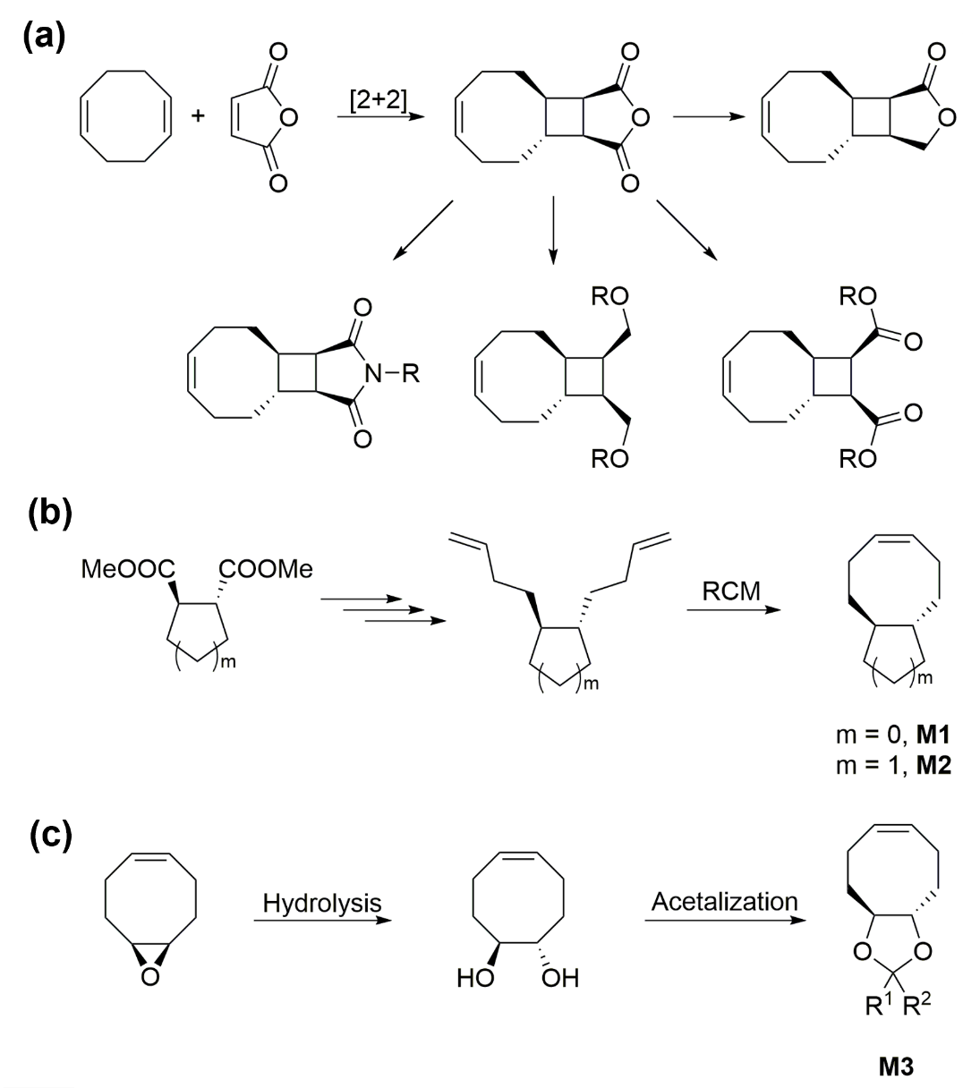 圖2. 并環環辛烯單體的合成。(a)不同取代的反式環丁烷并環辛烯單體的合成方案。(b)無取代基的反式環丁烷并環辛烯tCBCO (M1)和反式環戊烷并環丁烯tCPCO (M2)的合成方案。(c)反式五元環狀縮醛/酮并環辛烯單體tCACO (M3)的合成方案。