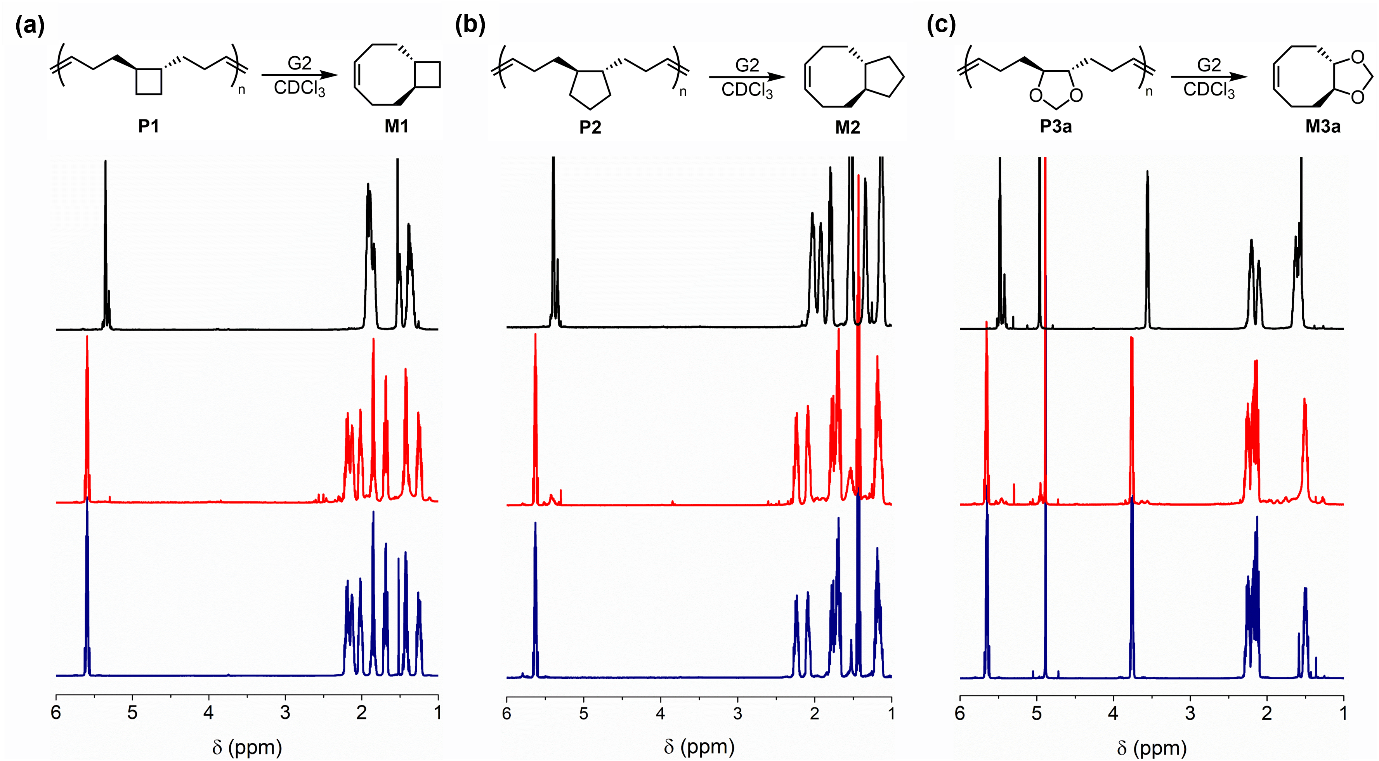 圖4. 并環環辛烯聚合物P1(a)、P2 (b)和P3a (c)的解聚。聚合物在1 mol% G2存在下,在50°C下加熱處理2小時之前(黑色)和之后(紅色)的1H NMR。相應單體的1H NMR(藍色)。在(b)和(c)中,可以觀察到 5.5~5.3 ppm范圍內低聚物的殘留,但(a)中幾乎沒有該信號,表明相較于P2 和P3,P1的解聚熱力學更為有利。