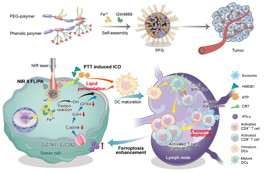 腫瘤來源的外泌體強烈抑制樹突狀細胞(DC)和T細胞的功能。外泌體表面程序性死亡配體1(PD-L1)的過度表達會導致PD-1/PD-L1免疫治療失敗,是腫瘤免疫治療的重要挑戰之一。逆轉外泌體PD-L1的免疫抑制,將有效恢復和促進T細胞的功能,從而分泌大量活性IFN-γ細胞因子,增強腫瘤細胞的鐵死亡。鑒于此,澳門大學代云路團隊構建一種新型光診療金屬-多酚網絡抑制外泌體分泌,協同光熱治療(PTT)以及鐵死亡治療增強腫瘤免疫原性死亡,并建立外泌體PD-L1抑制與鐵死亡的聯系,有望激發強有力的抗腫瘤免疫效應(圖一)。
