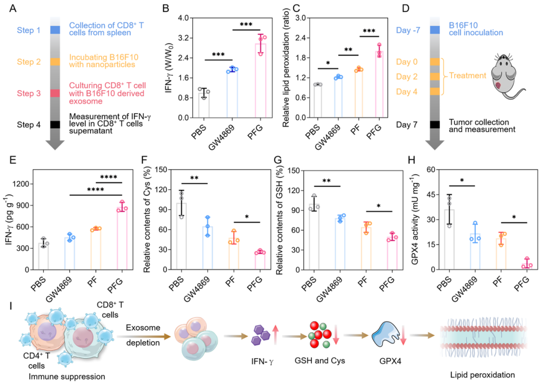 更重要的是,光診療金屬-多酚網絡中的GW4869能有效抑制外泌體的PD-L1,從而促進功能性T細胞的增殖。因此效應T細胞分泌活性IFN-γ 細胞因子,下調鐵死亡通路的關鍵分子(胱氨酸(Cys)、谷胱甘肽(GSH)和谷胱甘肽過氧化酶4(GPX4)),促進脂質過氧化,增強鐵死亡,(圖三)。該新型光診療金屬-多酚網絡實現免疫強化,高效激發抗腫瘤免疫效應和持久的特異免疫記憶,成功抑制原發、遠處和淋巴結轉移的黑色素腫瘤。這種聯合策略是精準惡性腫瘤免疫治療的新突破,為新一代外泌體免疫療法提供新的思路。