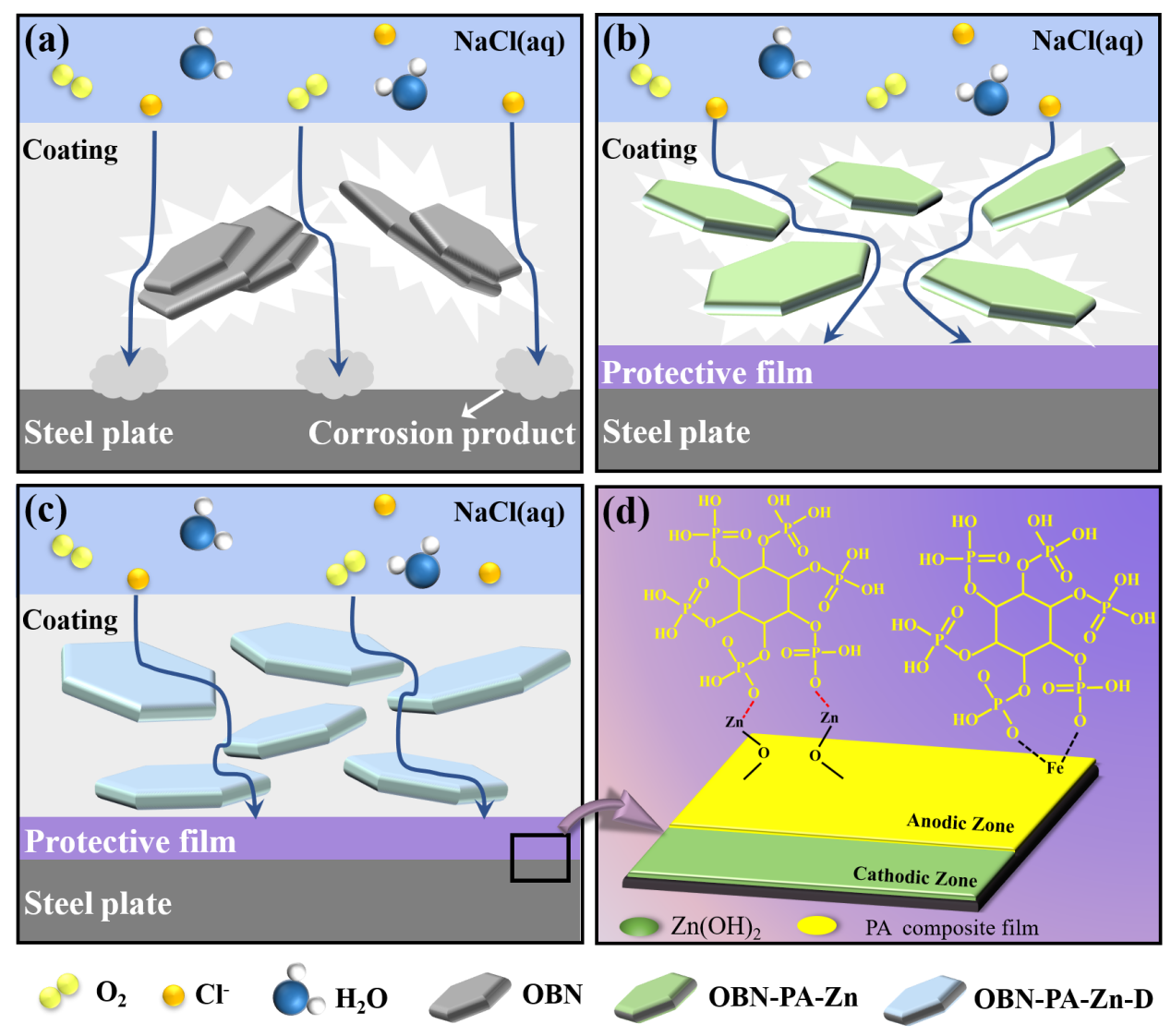 圖4. (a) OBN/WEP,(b) OBN-PA-Zn/WEP,(c,d)OBN-PA-Zn-D/WEP涂層防腐機理圖。