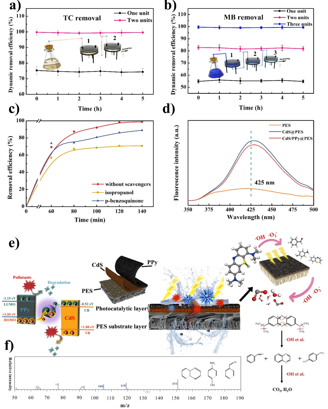 圖 不同數(shù)量膜組件對目標(biāo)污染物a)TC & b)MB的動態(tài)移除率;c)活性氧(ROS)種類捕獲情況檢測;d)OH猝滅熒光物質(zhì)分析;e)光催化與污染物移除機(jī)理;f)污染物降解過程中間產(chǎn)物的氣相色譜-質(zhì)譜譜圖
