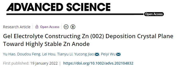 以上研究成果近期以“Gel Electrolyte Constructing Zn (002) Deposition Crystal Plane Toward Highly Stable Zn Anode” 為題,發表在《Advanced Science》,(Adv. Sci. 2022, DOI: 10.1002/advs.202104832)上。東華大學化學化工與生物工程學院武培怡教授和焦玉聰研究員為論文共同通訊作者。