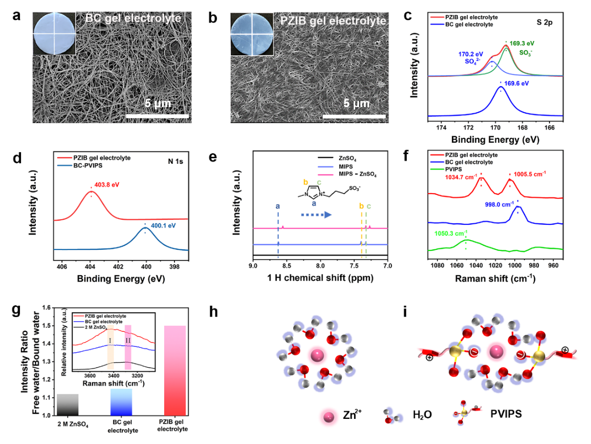 作者通過在BC膜上一步原位光聚VIPS單體制備PZIB凝膠電解質。其中,BC膜為凝膠電解質提供機械支撐,而PVIPS鏈貫穿于BC網絡中,為凝膠電解質提供官能化。X-射線光電子能譜、核磁共振譜、拉曼光譜及紅外光譜顯示出PZIB凝膠電解質中鋅離子的溶劑化結構[Zn(H2O)6]2+被PVIPS上的帶電基團(SO3-)重構為R-SO3- [Zn(H2O)4]2+ -SO3-R,這將改善鋅離子的沉積動力學,并進一步減少由水引發的一系列副反應。