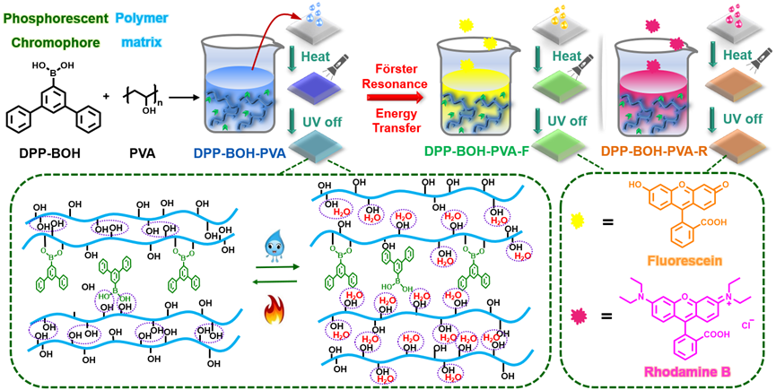 近日,李振教授團隊在刺激響應性的純有機室溫磷光研究方面取得突破。他們通過將磷光發色團DPP-BOH與聚合物基質PVA在水溶液中共價連接,得到了一種新型的刺激響應性室溫磷光材料。由于芳基硼酸和聚乙烯醇之間形成B-O共價鍵以及PVA鏈間的氫鍵相互作用提供的剛性環境,所制備的聚合物薄膜表現出超長的室溫磷光,壽命達2.43 s,磷光量子產率為7.51%。有趣的是,水分子會破壞相鄰PVA鏈間的氫鍵,從而改變該系統的剛性。因此,該薄膜的室溫磷光特性對水、熱刺激非常敏感。進一步地,通過在該體系中引入另外兩種長波發射的熒光染料,聚合物薄膜的余輝顏色能夠通過能量轉移從藍色調節到綠色再到橙色,并同時兼具刺激響應特性。最后,基于這三種長余輝材料的水/熱刺激響應、多色調控以及完全水溶液處理等特點,它們被成功地應用于信息防偽、絲網印刷和指紋記錄等領域。相關研究結果以“Completely Aqueous Processable Stimulus-Responsive Organic Room Temperature Phosphorescence Materials: Design Strategy, Tunable Afterglow Color and Corresponding Applications”為題,發表在《Nature Communication》(Nat. Commun., 2022, 13, 347)上。天津大學分子聚集態科學研究院博士研究生李丹為本文第一作者,共同通訊作者為楊杰副研究員、唐本忠院士和李振教授。