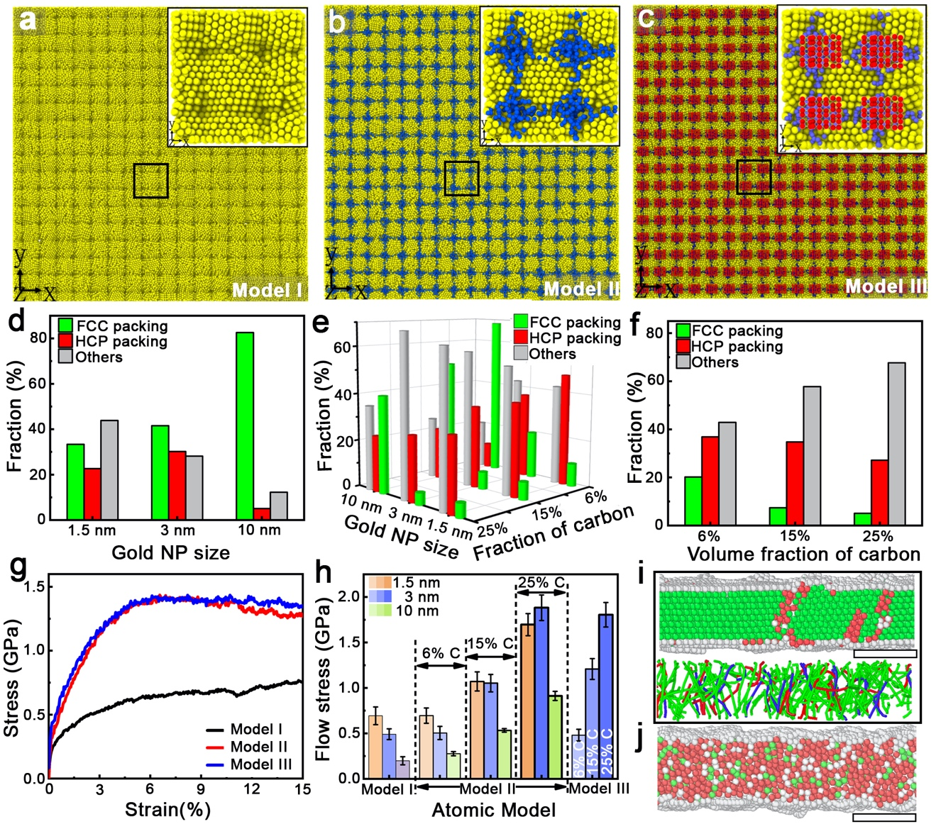 圖4 (a-c) 金納米片的三種原子模型圖。其中模型I是由等軸金納米顆粒構成;模型II是由等軸金納米顆粒與一定含量的非晶碳構成;模型III是模型II和分散在非晶碳上方的聚乙烯(PE)分子鏈的混合物。(d-f) 模型 I、模型 II 和 模型 III 中,原子微觀結構隨金納米顆粒的尺寸(d)和非晶碳含量的變化。(g) 模型I, II和III在d = 3 nm 和含 15%非晶碳時的典型應力-應變曲線。(h)模型I, II和III在不同金納米顆粒尺寸和非晶碳含量下的計算屈服強度。(i,j) 在 10% 應變下,模型I和含有15%非晶碳的模型II的局域結構和位錯分析。
