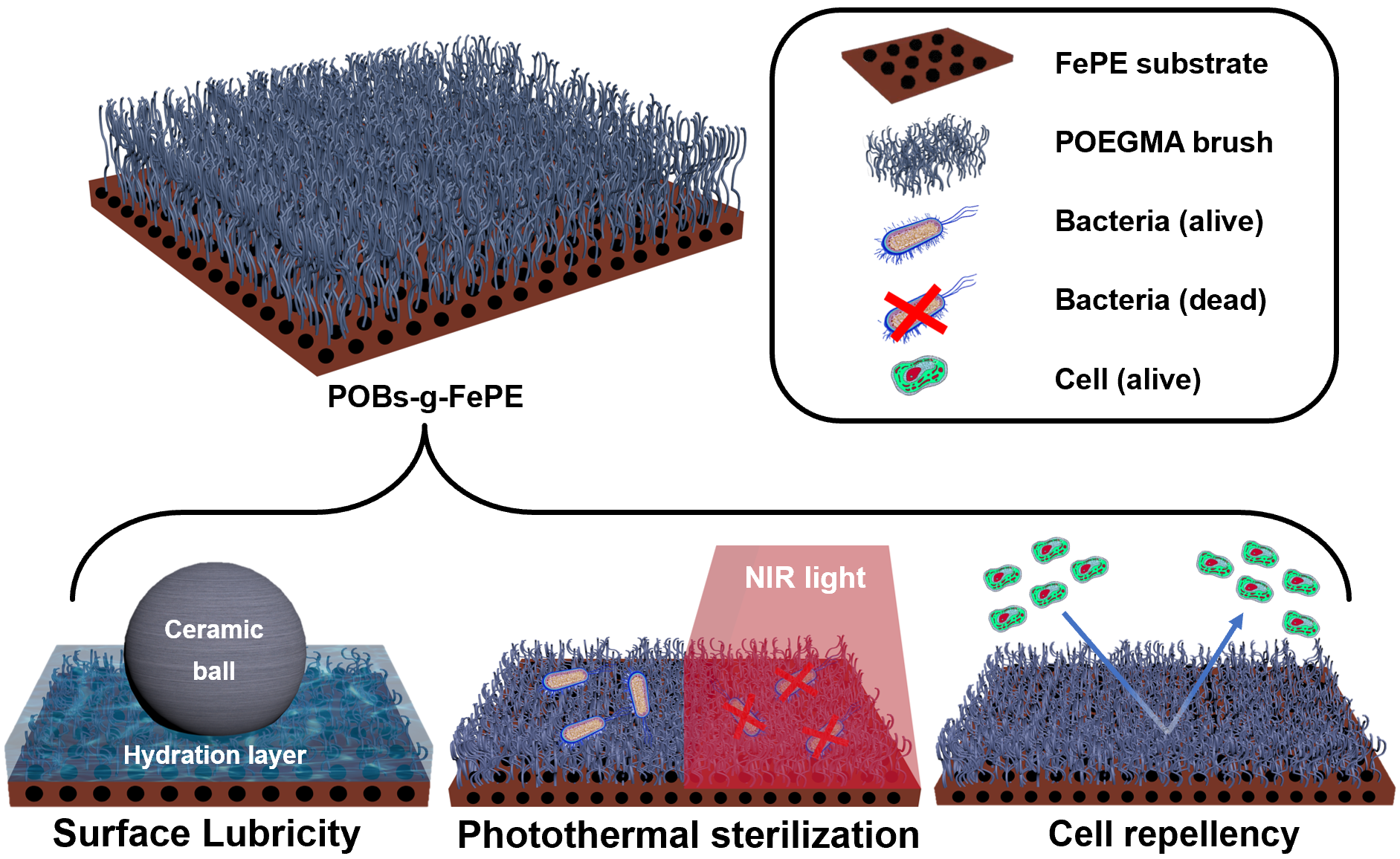 近期西北工業大學劉國強教授課題組開發了一種具有快速光熱滅菌和強抗細胞黏附性的超潤滑硅橡膠彈性體,研究成果以題“Super-Lubricating Hybrid Elastomer with Rapid Photothermal Sterilization and Strong Anti-Cell Adhesion”發表于Chemical Engineering Journal, 2022, 434, 134763。該材料的制備策略是通過有機/無機混合與表面該新的組合,同時賦予硅彈性體光熱響應性能與潤滑功能性表面。首先,將具有強光熱效應的四氧化三鐵納米顆粒嵌入硅橡膠基底并固化,賦予材料光熱響應性能。然后通過表面自由基聚合將具有水潤滑與抗黏附功能的聚合物接枝在硅橡膠基底表面上,實現材料表面的水和潤滑與抗黏附功能。展望未來,基于此類多功能硅橡膠材料的醫用導管將顯示其在潤滑減輕導管插拔疼痛、抗組織粘連和高效滅菌方面的優點。近年來,該課題組在功能水合潤滑材料領域做了一系列研究工作,受邀以題“Polymer-based lubricating materials for functional hydration lubrication”在Chemical Engineering Journal, 2022, 429, 132324上,系統闡述了圍繞水合潤滑的機理研究、材料設計及功能應用等。
