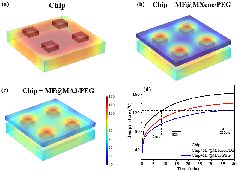圖3:(a) 芯片,(b) 芯片+MF@MXene3/PEG和(c) 芯片+MF@MA3/PEG的有限元模擬溫度分布圖;(d) 芯片溫度隨工作時間的變化曲線。