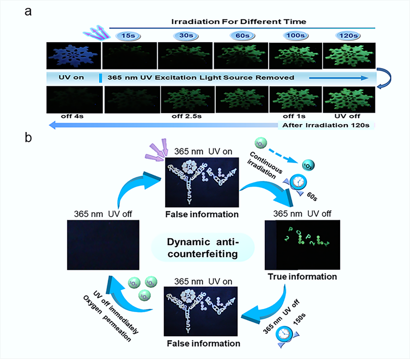 這些材料光誘導聚合物室溫磷光材料制備過程簡便、綠色環保,利用光誘導發光特性,材料在空氣中放置一個月仍能通過紫外光輻照實現磷光發射的動態循環過程,其低功率激發、快速響應、高穩定性、不需封裝的優勢,在圖像顯示和多級信息動態防偽領域表現出誘人的應用前景。
