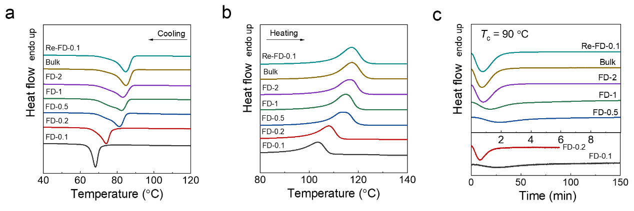 與完全纏結(jié)(溶液澆筑和重新纏結(jié))的樣品相比,冷凍干燥制備的低纏結(jié)程度樣品具有較慢的結(jié)晶速率(圖2),表明解纏結(jié)減緩了晶型II的生成速率。這些結(jié)果不同于常規(guī)的高分子體系(通常是解纏結(jié)加速結(jié)晶),這是因為解纏結(jié)提高了聚丁烯-1側(cè)基的活動性,進而增加了晶型II形成的位阻。