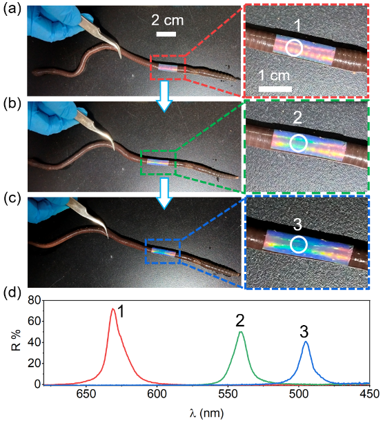 圖 2 人工變色龍皮膚用于自報告蚯蚓皮膚應(yīng)變