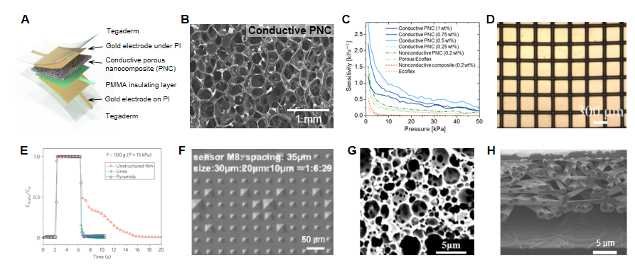 文章首先簡(jiǎn)要回顧了近年來(lái)柔性CPS在如何提高靈敏度上取得的成就,過(guò)去研究主要通過(guò)(1)減小介電層的楊氏模量,(2)提高介電常數(shù)的辦法來(lái)提高靈敏度。多孔或表面陣列微結(jié)構(gòu)的復(fù)合材料能同時(shí)滿足上述條件因而能提高靈敏度(圖1)。然而,這些方法只在較小的壓力范圍有效。