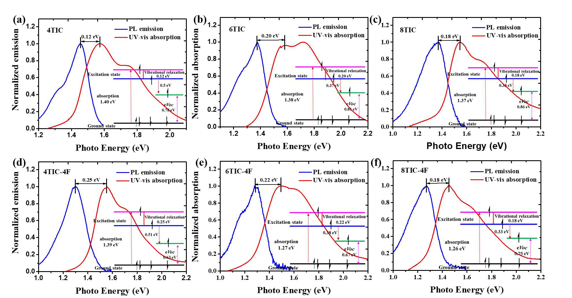 圖4. (a) 4TIC、(b) 6TIC、(c) 8TIC、(d) 4TIC-4F、(e) 6TIC-4F、(f) 8TIC和 (g) 8TIC-4F的PL發(fā)射光譜和紫外-可見(jiàn)-近紅外吸收光譜,插圖是六個(gè)受體體系的基態(tài)和激發(fā)態(tài)的能級(jí)示意圖。