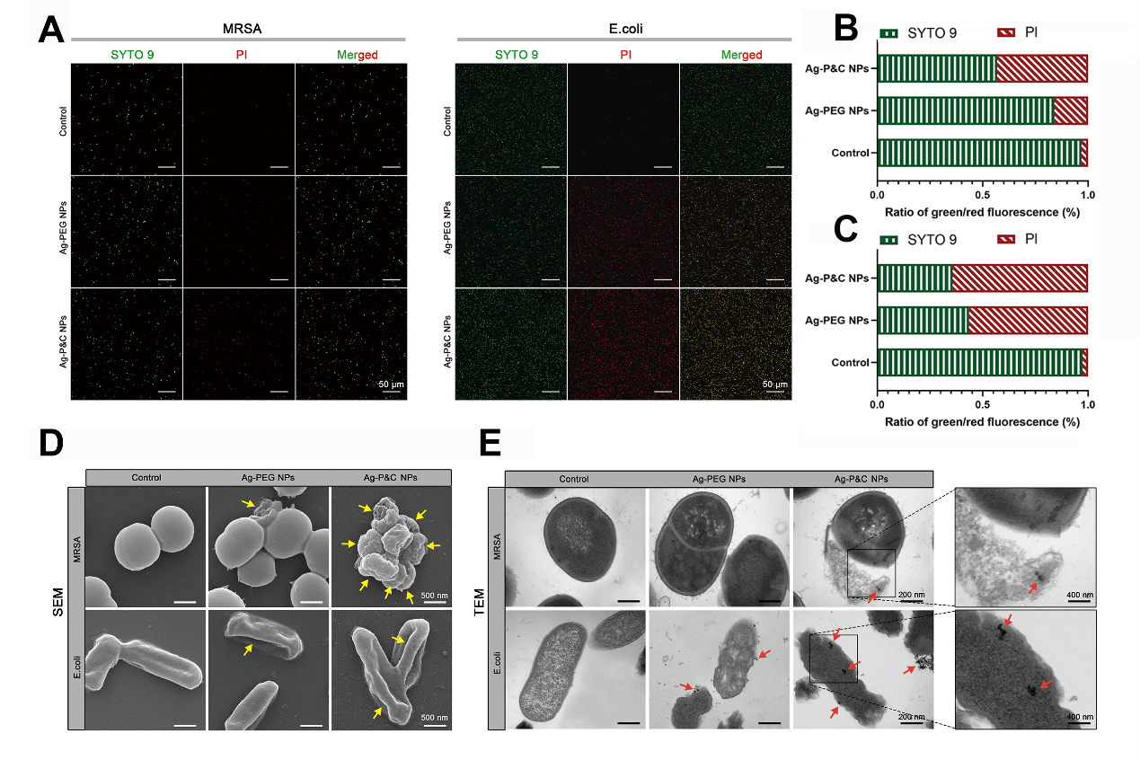 2)pH響應性自聚集納米粒Ag-P&C NPs可以在MRSA和E. coli表面發生靶向的自聚集,可以實現在細菌體內的蓄積,導致細菌胞內物質分布不均,出現結構塌陷,甚至明顯皺縮。