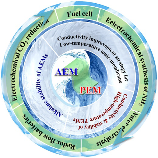 聚合物電解質(zhì)膜作為電化學(xué)裝置的核心組件,長期以來受到了廣泛的關(guān)注和研究。目前報道的大多數(shù)聚合物電解質(zhì)膜整體性能仍存在一些不足,需要進(jìn)一步探究。近期,中國科學(xué)技術(shù)大學(xué)徐銅文教授針對當(dāng)前聚合物電解質(zhì)膜存在的問題及未來發(fā)展方向進(jìn)行了展望。文章探討了聚合物電解質(zhì)膜實(shí)際應(yīng)用所面臨的重要挑戰(zhàn)(包括如何突破常用相分離策略提高聚合物電解質(zhì)電導(dǎo)率的限制,如何開發(fā)適用于高溫低濕工作環(huán)境的質(zhì)子交換膜,如何提升陰離子交換膜耐堿性及未來可擴(kuò)展應(yīng)用場景),綜述了高性能聚合物電解質(zhì)膜的先進(jìn)設(shè)計策略并進(jìn)一步提出了未來發(fā)展方向。