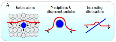 A(自左向右):固溶強化、第二相彌散或沉淀強化、加工(或應變)強化