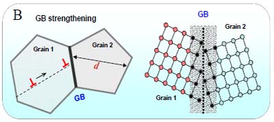 B:晶粒細化強化 (或晶界強化) A和B分別是材料的傳統強化途徑示意圖