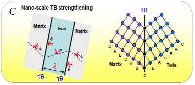 C為新提出的納米尺度孿晶界強化示意圖,右側為一孿晶界示意圖