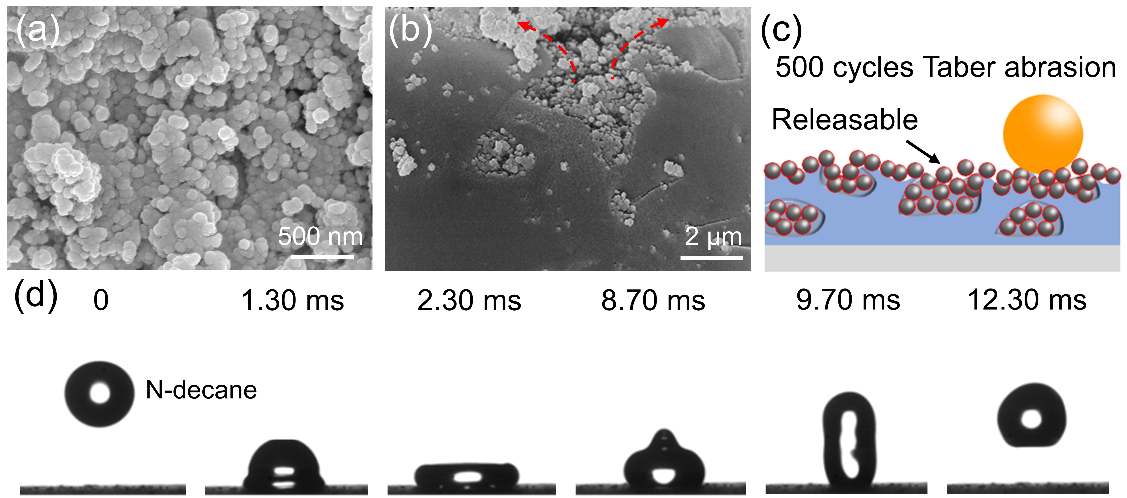 課題組團隊通過底面合一及噴涂的工藝,以全氟氯硅烷為改性劑制備出高接枝率的功能納米顆粒,引入磷酸二氫鋁為無機粘結劑,通過化學鍵合增強顆粒間的結合力,同時,功能顆粒在涂覆過程中的相分離和再團聚能顯著提高涂層體系的機械耐久性,粘結劑也能提高涂層的內聚力,以及與基底的附著力,示意圖如圖1。該方法工藝設備簡單,利于規模化批量制備,有較大的工業應用優勢。