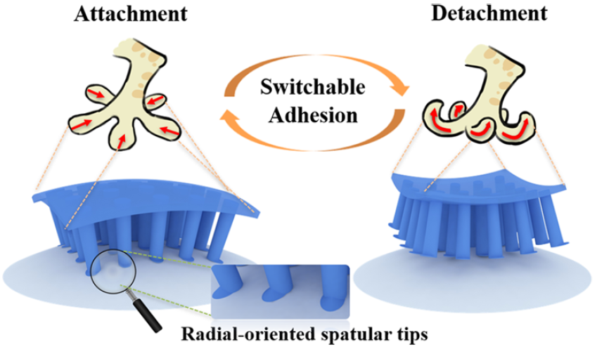 受壁虎剛毛結構的啟發,設計制備出的仿生可逆黏附墊在工業生產、生物醫療、智能機器人以及航空航天等領域具有巨大的應用前景。然而,仿生可逆黏附很多是在平面上實現的,在具有寬曲率范圍的球面上實現強黏附和可控脫附仍具有很大的挑戰。