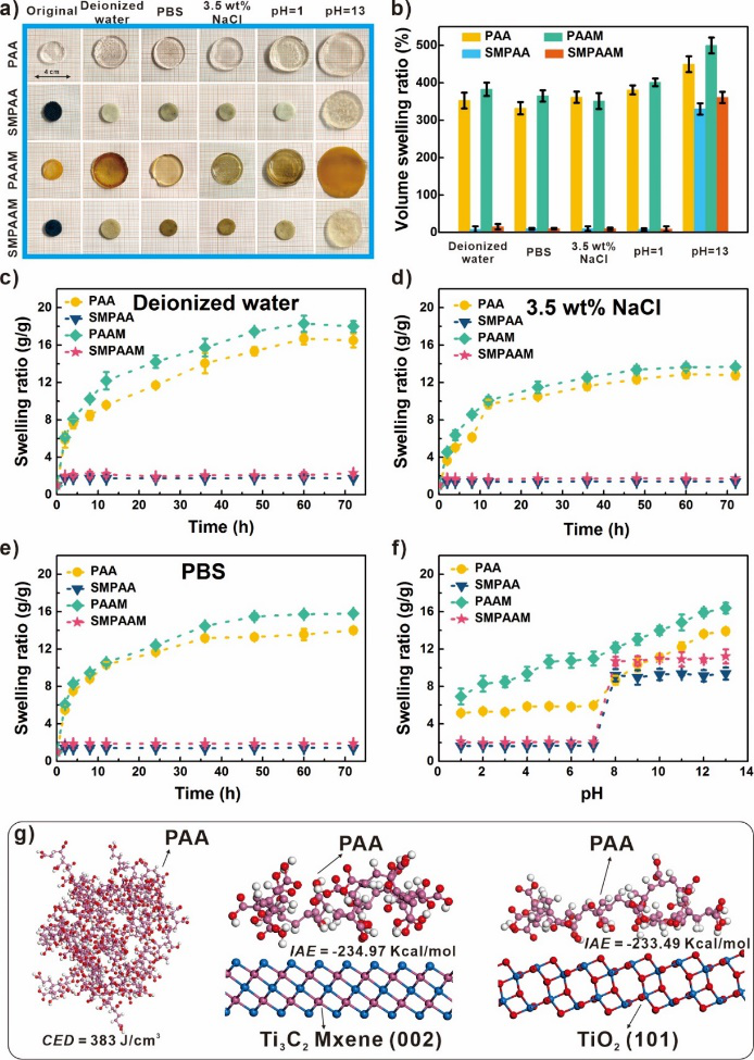 3. 不同水凝膠在不同條件下的溶脹特性。(a) PAAPAAMSMPAASMPAAM水凝膠在不同介質下浸泡72 h的照片; (b) 72 h后不同環境中水凝膠的溶脹體積比;水凝膠在(c)去離子水、(d) 3.5 wt% NaCl、(e) PBS溶液和(f)不同pH值溶液中隨時間變化的溶脹重量比;(g) PAA-PAA、PAA-Ti3C2MXenePAA-TiO2之間相互作用的分子動力學模擬。