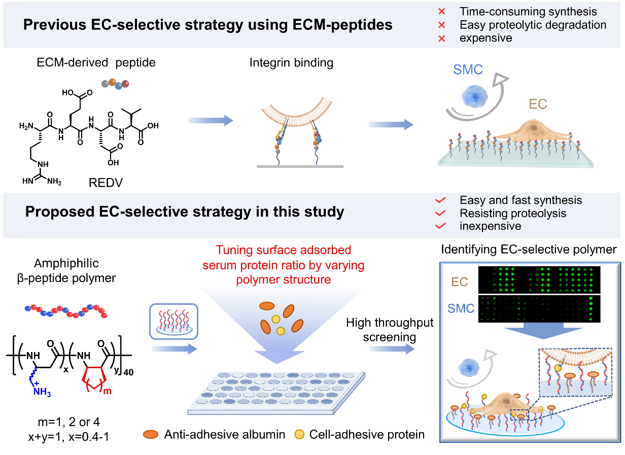 圖1. 用于內(nèi)皮細(xì)胞選擇性黏附的細(xì)胞外基質(zhì)衍生肽策略以及β-多肽聚合物策略