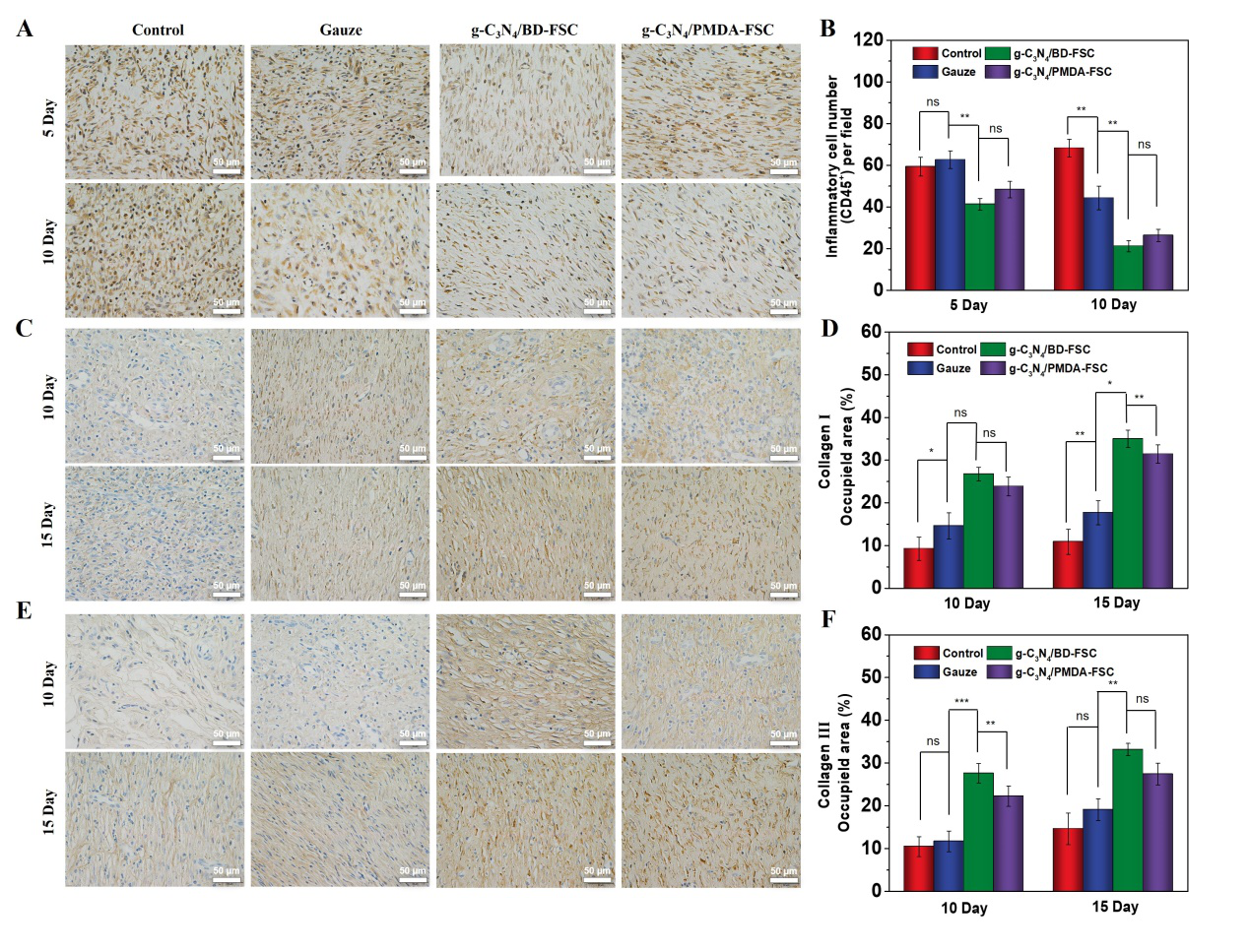 由圖6表明,以g-C3N4/BD-FSC和g-C3N4/PMDA-FSC兩個樣品作為敷料對應的感染創(chuàng)傷在修復階段(第10天)的炎癥情況明顯降低,并且在傷口修復后期,重新生長的膠原蛋白較其他敷料對照組更為明顯,這說明開發(fā)的光活性平板絲敷料具有顯著的促進創(chuàng)傷修復的作用。