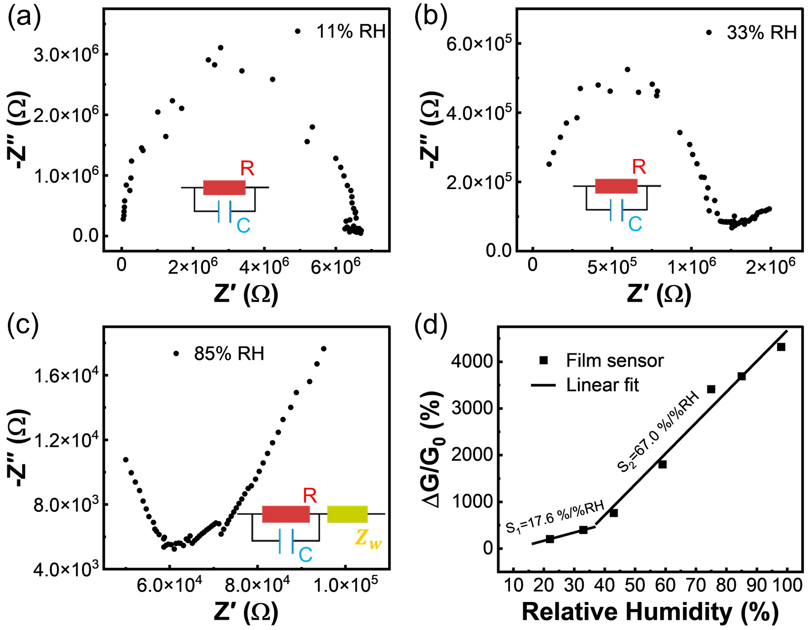 圖3. 濕度傳感器的在不同相對濕度環境下的復阻抗圖譜和其濕度傳感性能。